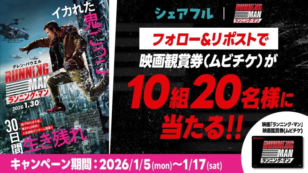 グレン・パウエル主演の1月20日公開の映画『ランニング・マン』の映画鑑賞券(ムビチケ)が当たるキャンペーンを実施中!