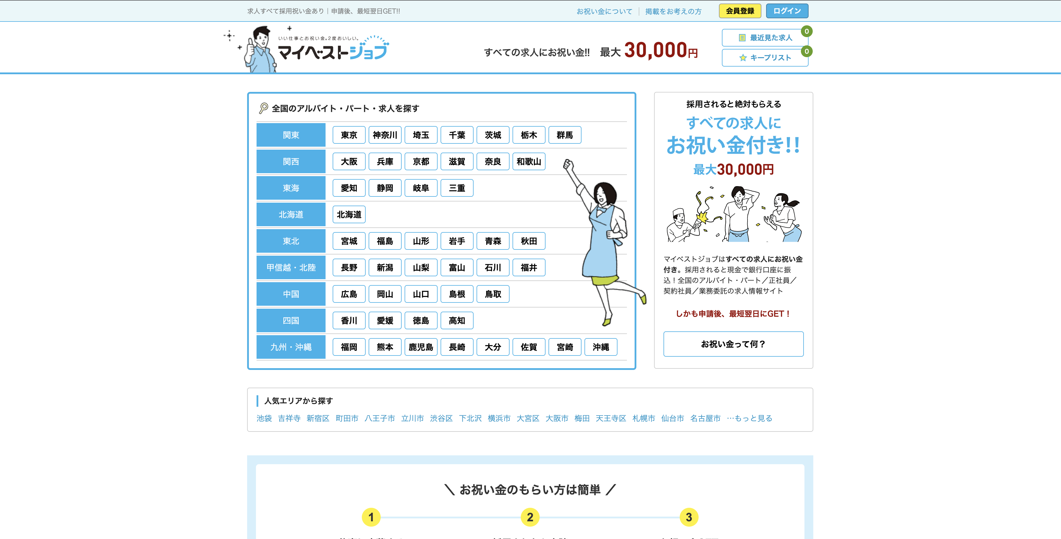 最大30,000円までのお祝い金がもらえることで利用者を増やしているのがマイベストジョブです。他にも広報活動などに非常に力を入れており関東エリアではJ-WAVE、東海エリアではZIP-FMでのラジオCMが毎日大量に配信されており、認知を拡大しているサイトです。また応募課金でもなく完全な成果報酬型サイトですので採用が決まるまで一切費用がかかることがありません。