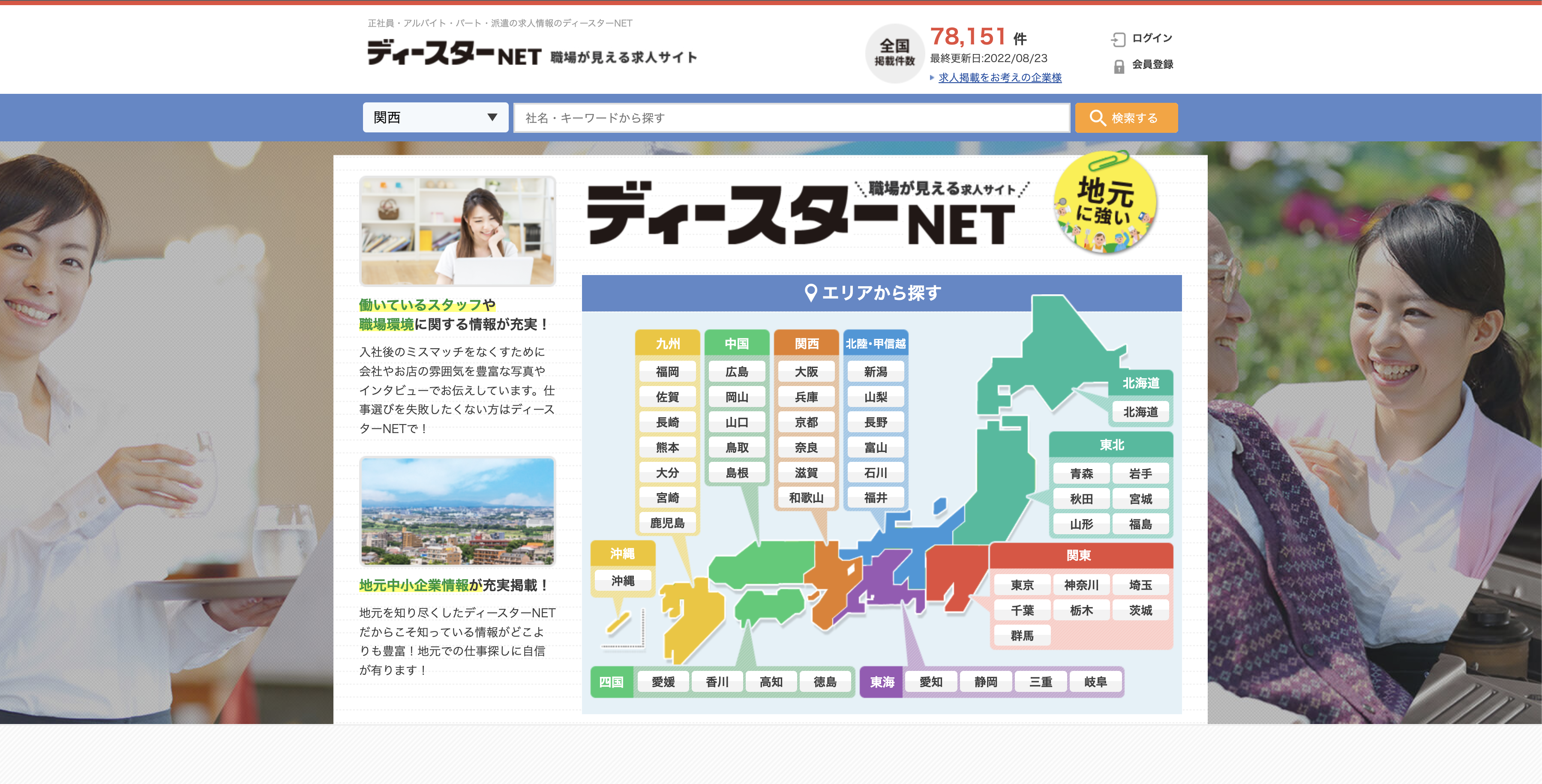 関西を中心に地域密着型で人材採用支援を行なっている大新社が運営しているインターネット求人媒体がディースターNETです。オンラインでの商談だけでなく直接足を運んでの商談なども柔軟に対応しており人とのつながりを大切にした営業・サポートが特徴です。また、職場情報をしっかりと伝えられる情報量を掲載させることで採用簿のミスマッチも減らすことができます。