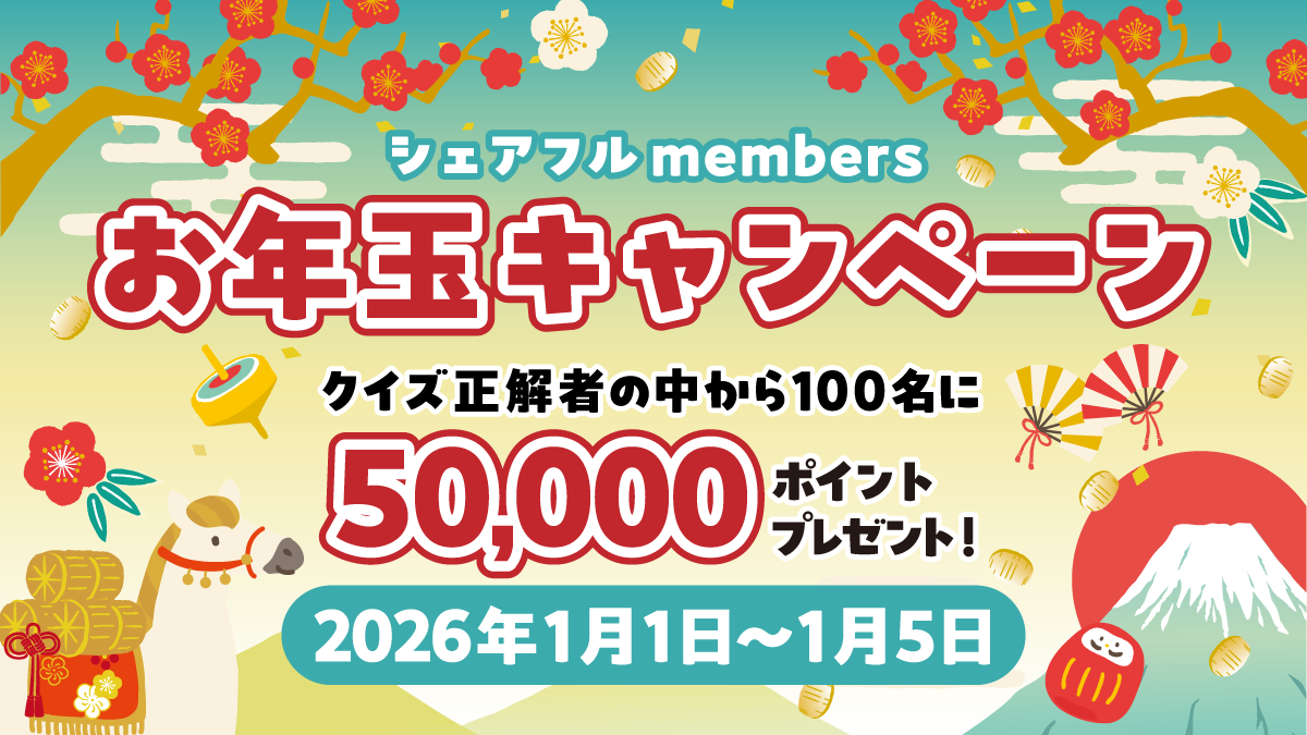 2025年もシェアフルをご利用いただきありがとうございました!2026年もシェアフルを利用いただく皆様に感謝を込めて、お年玉キャンペーンを開催します。