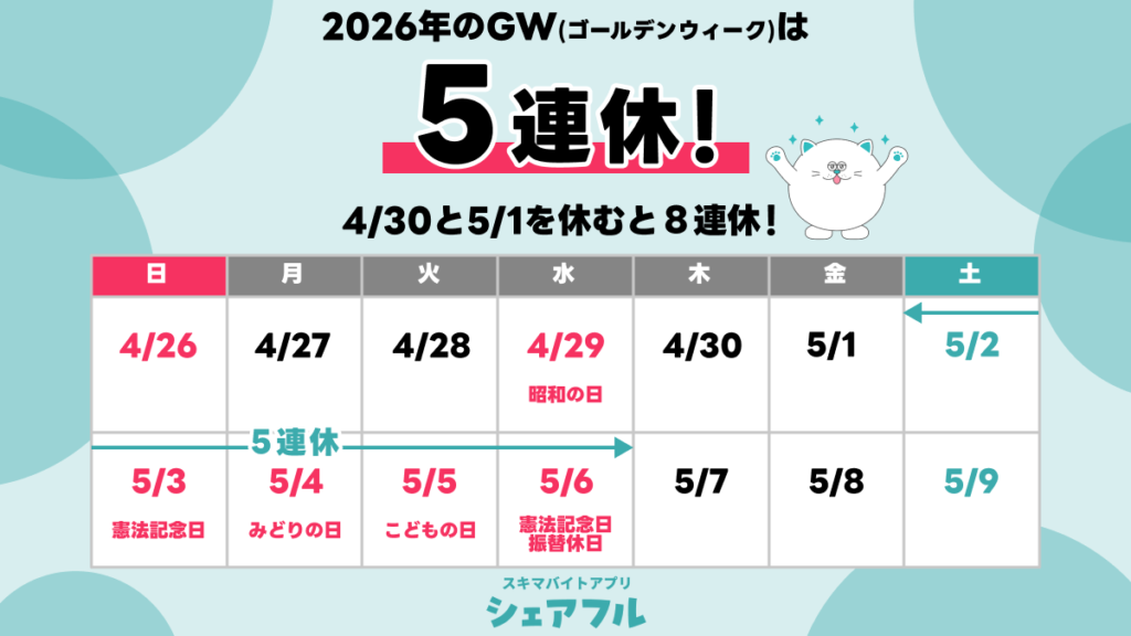 ゴールデンウィークを活用して、単発バイトに挑戦してみませんか?イベントスタッフやキャンペーン業務、リゾートバイトなど、短期間で効率よく稼げる仕事を探すには、手軽で選択肢豊富なスキマバイトアプリ「シェアフル」を活用するのもおすすめです。
