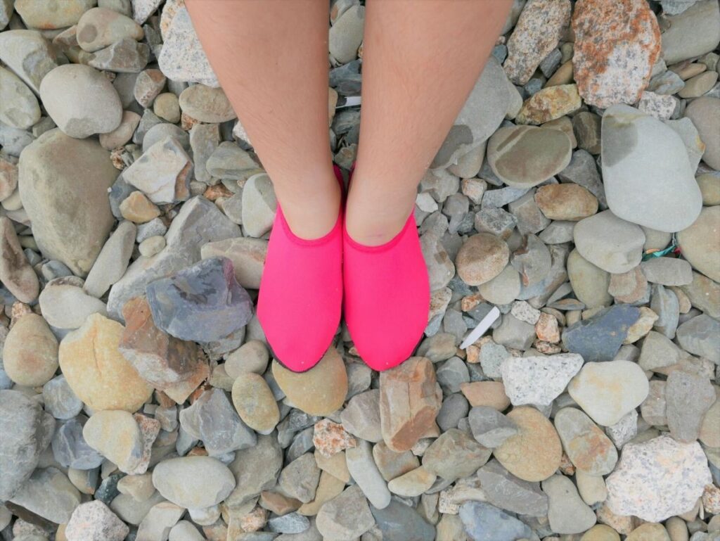 - 足元の貝殻や小石に注意する