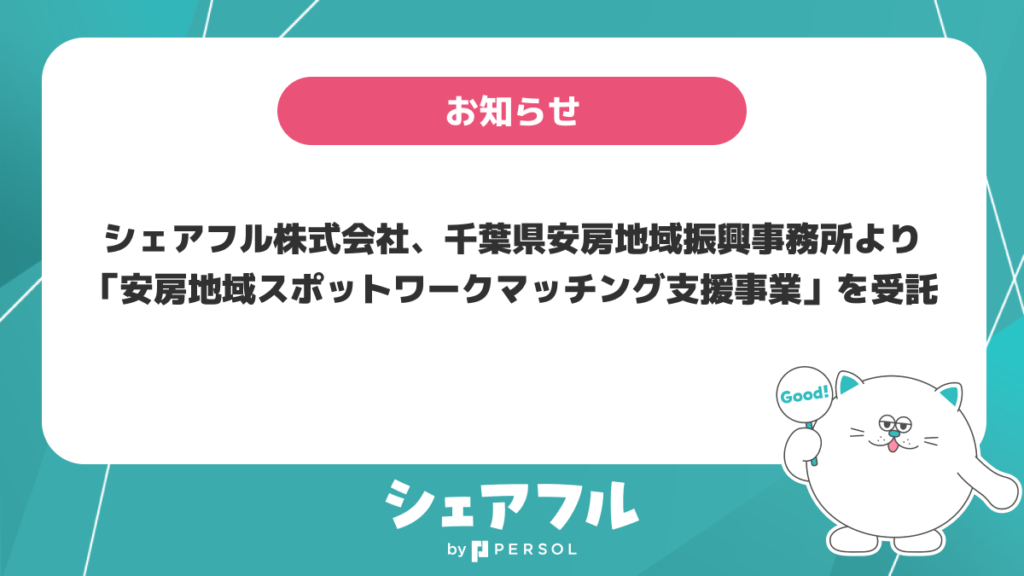 「はたらいて、笑おう。」をビジョンに掲げるパーソルグループのスキマバイトアプリ『シェアフル』や就業実績を活用した人材紹介サービス『シェアフルエージェント』、SaaSシフト管理サービス『シェアフルシフト』などを提供するシェアフル株式会社(本社:東京都港区、代表取締役社長:横井 聡)は、令和7年度に千葉県安房地域振興事務所が実施する「安房地域スポットワークマッチング支援事業」の受託事業者となったことをお知らせします。