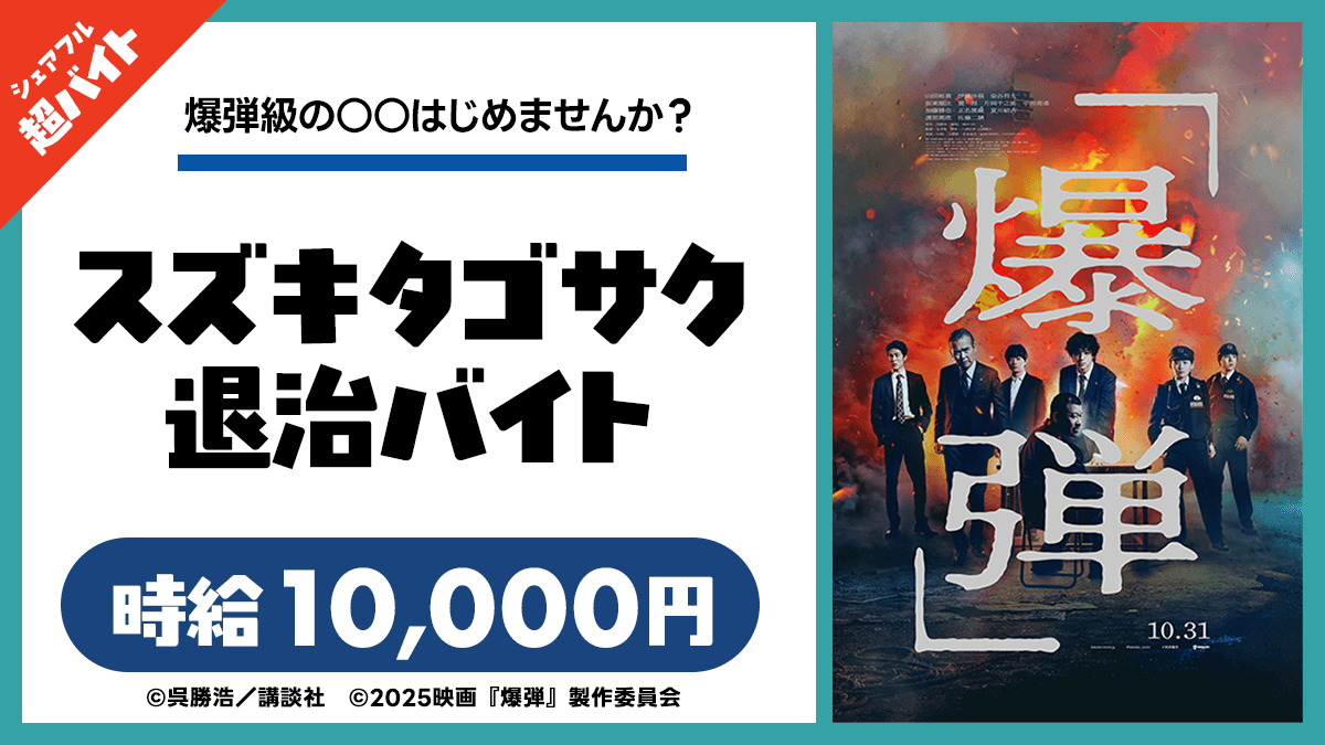 【爆弾級の○○はじめませんか?!】山田裕貴、伊藤沙莉、染谷将太、佐藤二朗、等豪華俳優陣が出演する10月31日(金)公開の映画『爆弾』のイベントにて”スズキタゴサク退治バイト”を募集!