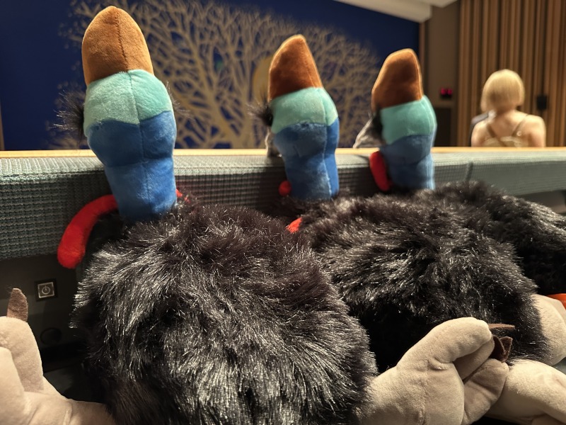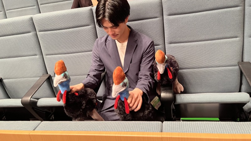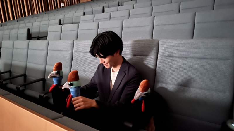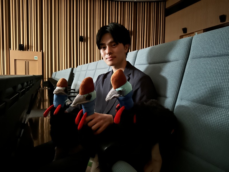ヒクイドリのぬいぐるみをしっかりと抱えて、舞台挨拶が始まるのを待ちます。