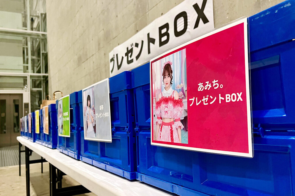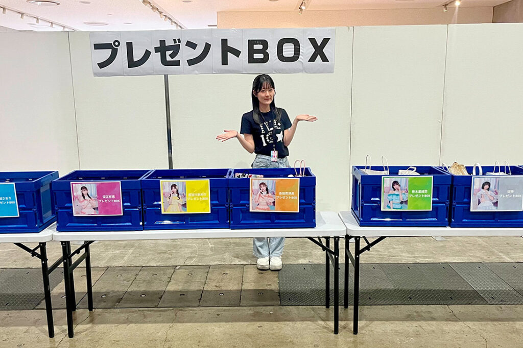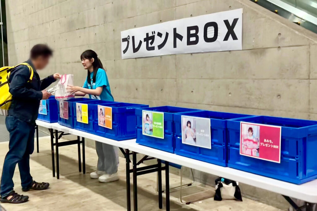 ライブが終わると、いよいよ業務がスタート。まずは会場ロビーに設置されたプレゼントBOXで、ファンの皆さんからメンバーへの手紙やプレゼントを受け取ります。