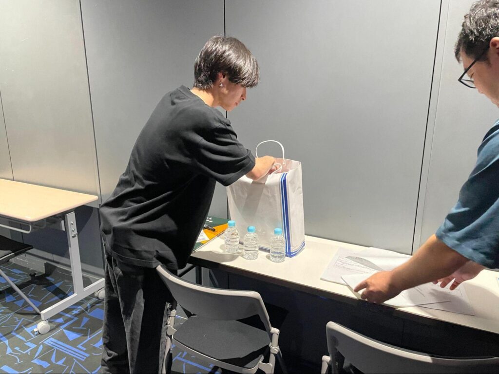 現地に到着したら、まずは非売品のオリジナルTシャツのプレゼントが!早速着替えて、スタッフの方から当日の業務の流れについて説明を受けました。映画『沈黙の艦隊 北極海大海戦』や舞台挨拶に関する概要も聞いた上で、キャストやMCの方が飲むお水を準備。人数分のペットボトルを運び、舞台袖に並べていきます。