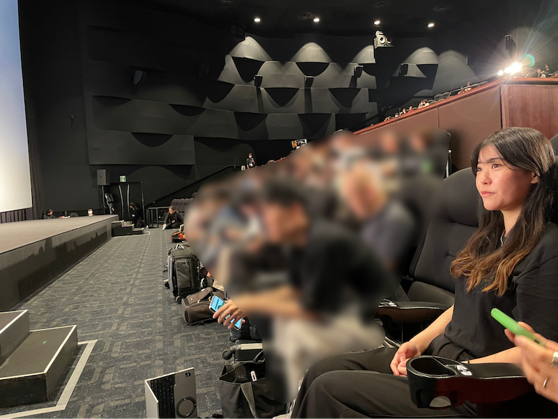 今回の会場はTOHOシネマズ六本木。現地で合流し、関係者パスを受け取り「マスコミ受付ブース」へ移動。普段、観客として訪れることはあっても、裏側のスペースに立ち入るのは初めてという松本さん。開始前から独特の緊張感が漂っていました。