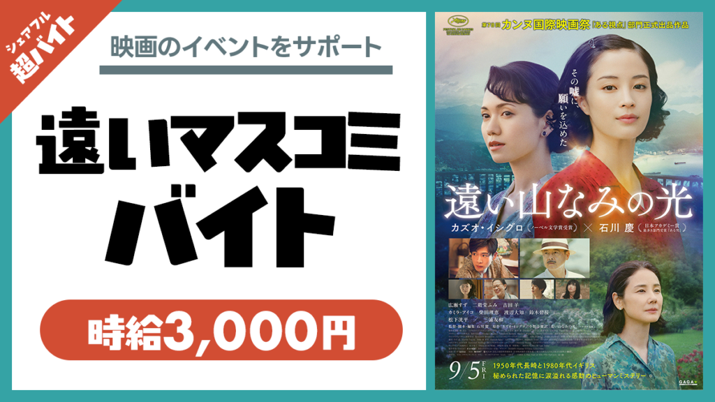 今回の「シェアフル超バイト」は、主演・広瀬すずをはじめ、二階堂ふみ、吉田羊、松下洸平、三浦友和といった豪華キャストが出演する映画『遠い山なみの光』の舞台挨拶にてマスコミの受付をするスキマバイトを募集しました。