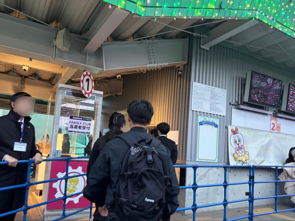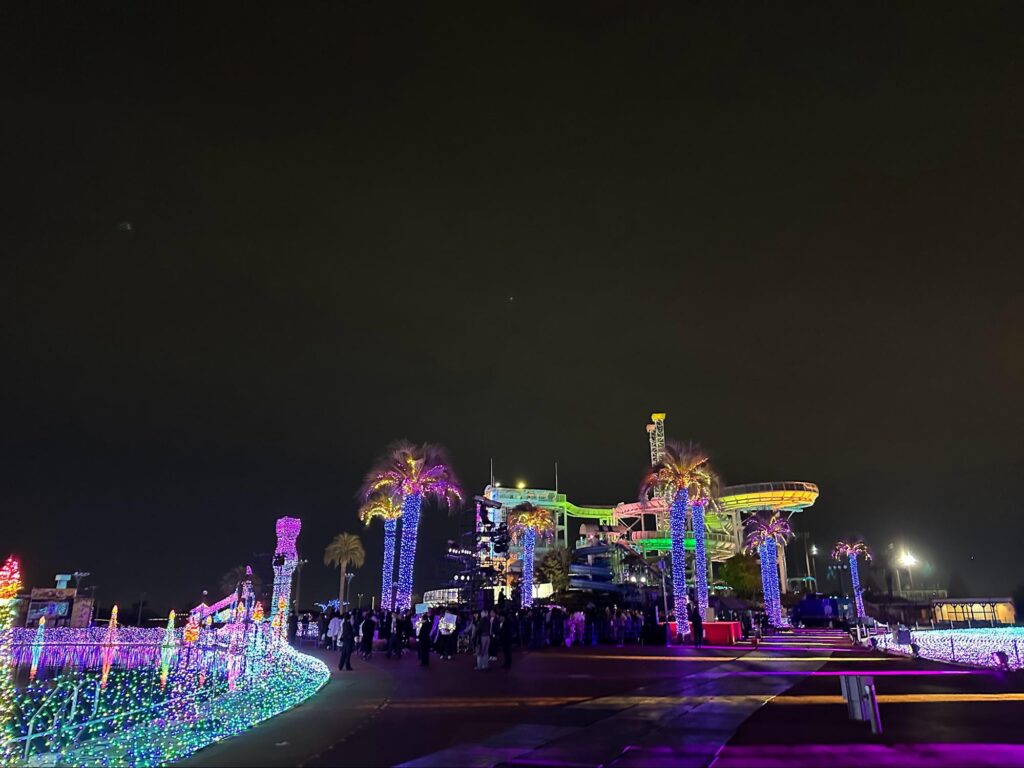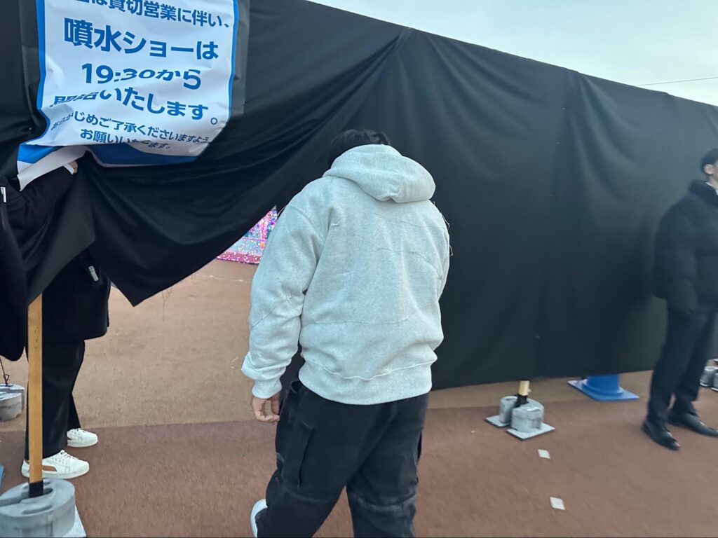 着替え終わったら、屋外の会場へ移動します!ランド内の圧巻のイルミネーションを楽しみながら、お客さんが到着するまで仕事内容や立ち位置を確認します。パーカーの点灯の仕方も念入りにチェック!