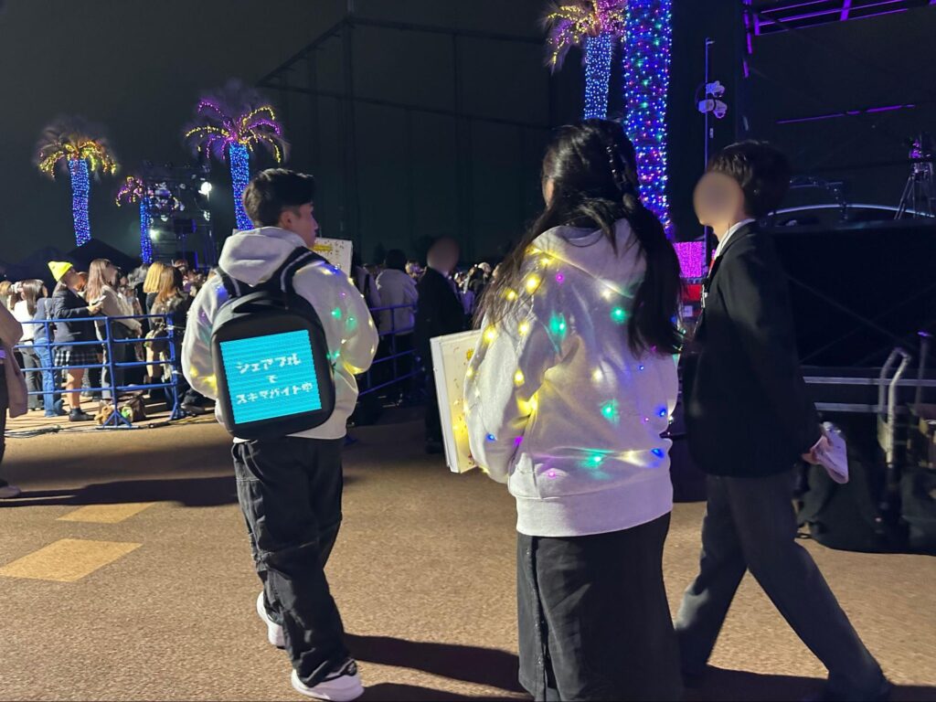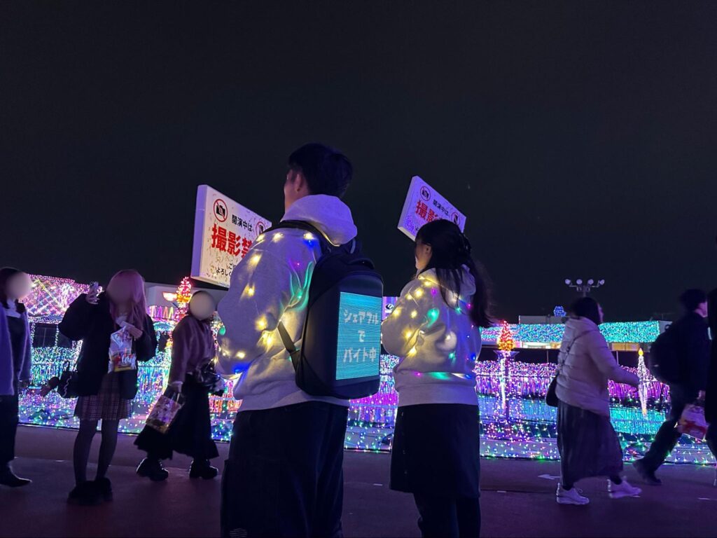 イベント終了後、再び点灯しながら来場者の退場を案内します。イルミネーション人間として写真撮影にも答えながら、声をかけてくださった方々との交流を楽しみました!