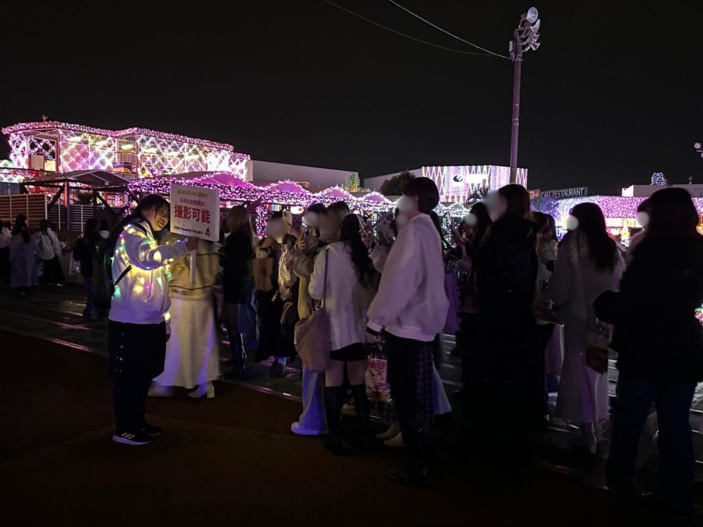 イベント来場者の方々が続々と来場する中、イベント開始まで撮影可能であることをお知らせしながら、会場に誘導します。通り過ぎる方も”イルミネーション人間”に興味津々!