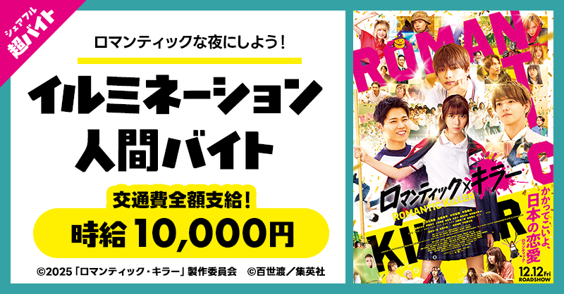 今回の「シェアフル超バイト」は、2025年12月1日(月)に遊園地・よみうりランドで開催された映画『ロマンティック・キラー』のイベントにて、イルミネーションをまとってお客様をを誘導するというお仕事です。自らがイルミネーションをまとい、ロマンティックな雰囲気を演出するスキマバイトを募集しました。当日は参加者の皆さまに、“イルミネーション人間”になるというレアな体験を楽しんでいただきました。