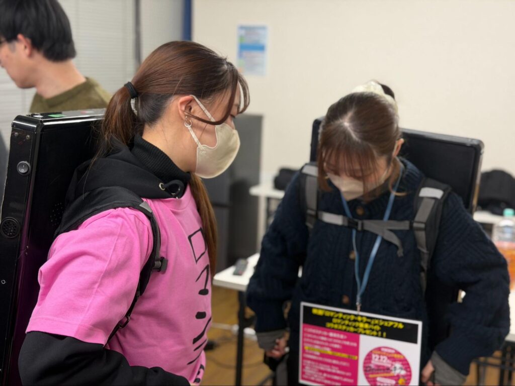 説明を聞き終わったら、映画の予告が流れるモニターを一人ずつ背負っていきます。映画『ロマンティック・キラー』宣伝用Tシャツを着用する参加者の方も!