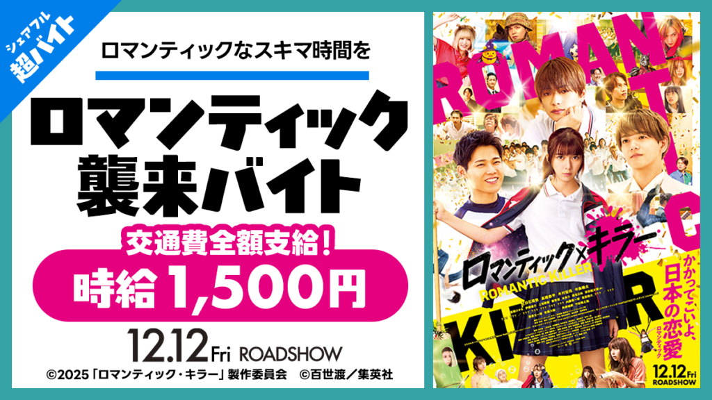 【全国5都市で大募集!】上白石萌歌× 高橋恭平(なにわ男子)×木村柾哉(INI)×中島颯太(FANTASTICS)のクアトロ主演、12/12(金)公開の映画『ロマンティック・キラー』の宣伝をする”ロマンティック襲来”バイトを募集!