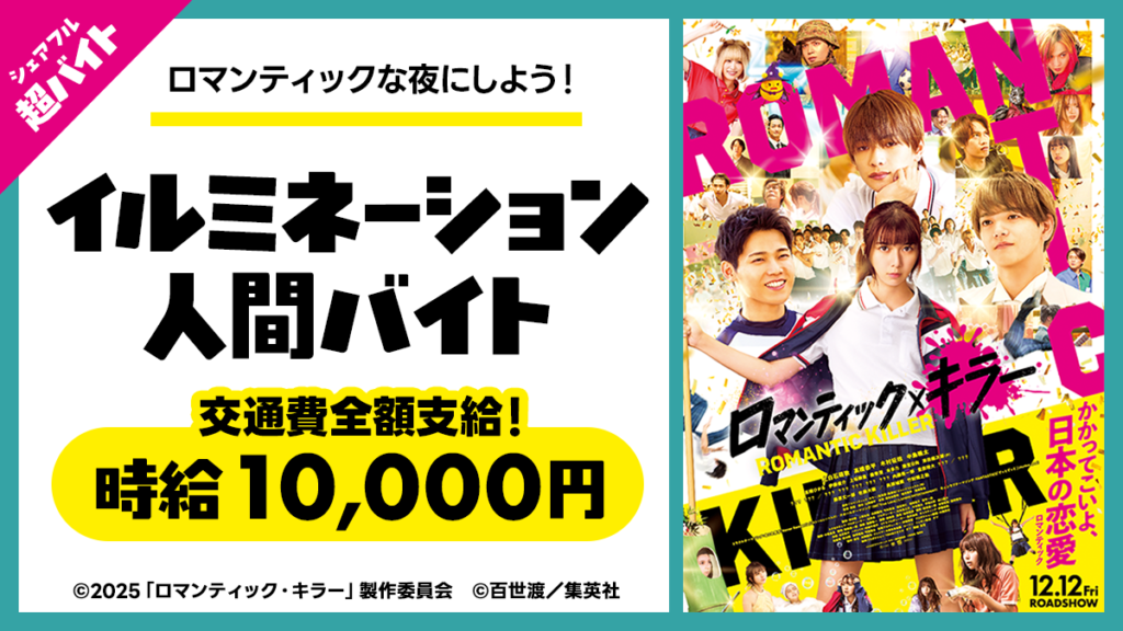 【ロマンティックな方はいませんか?】上白石萌歌× 高橋恭平(なにわ男子)×木村柾哉(INI)×中島颯太(FANTASTICS)のクアトロ主演の映画『ロマンティック・キラー』のイベントで”イルミネーション人間”バイトを募集!