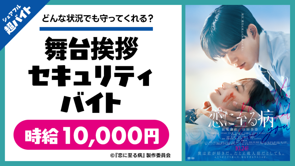 【どんな状況でも守ってくれる?】10月24日(金)長尾謙杜×山田杏奈 最旬俳優W主演、映画『恋に至る病』のイベントにて、舞台挨拶”セキュリティバイト”を募集!