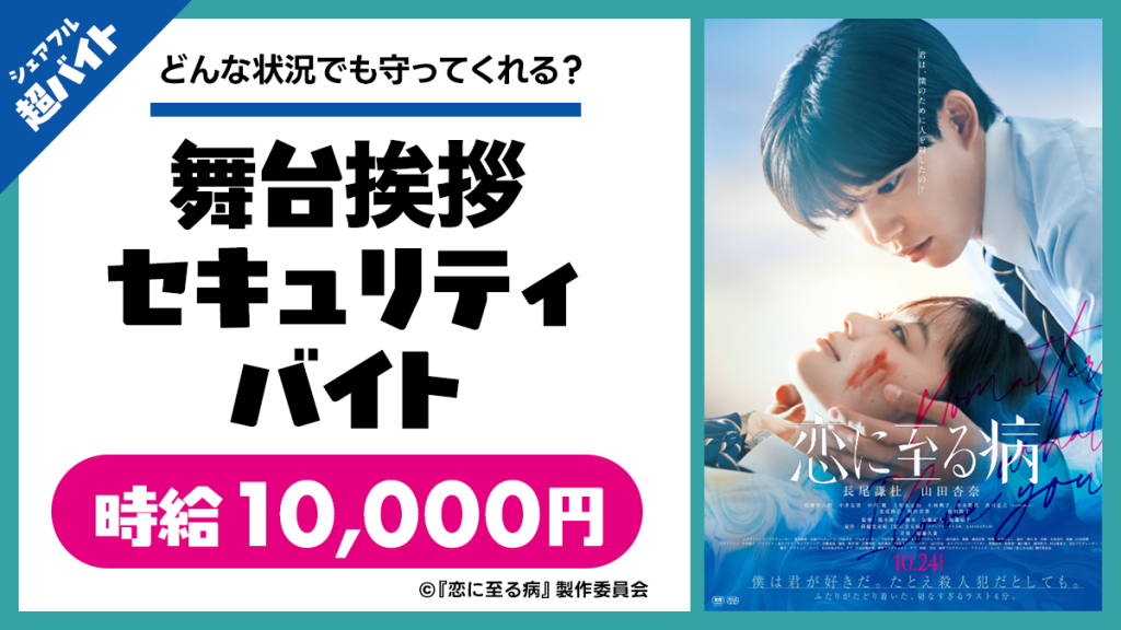 「はたらいて、笑おう。」をビジョンに掲げるパーソルグループのスキマバイトアプリ『シェアフル』やSaaSシフト管理サービス『シェアフルシフト』、就業実績を活用した人材紹介サービス『シェアフルエージェント』などを提供するシェアフル株式会社(本社:東京都港区、代表取締役社長:横井 聡)は、10月24日(金)に都内で開催される、映画『恋に至る病』のイベントにて、舞台挨拶“セキュリティバイト”を募集します。