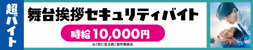 10月24日(金)に都内で開催される、映画『恋に至る病』のイベントにて、お客様誘導や舞台挨拶時の客席にて案内ボードを掲げ、舞台挨拶のスムーズな進行を守る超バイトを募集します。本映画は、長尾謙杜と山田杏奈が共演する注目の映画です。
