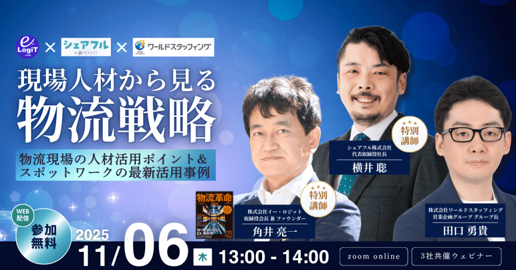「はたらいて、笑おう。」をビジョンに掲げるパーソルグループのスキマバイトアプリ『シェアフル』を提供するシェアフル株式会社(本社:東京都港区、代表取締役社長:横井 聡)は、2025年11月6日(木)に開催される株式会社ワールドスタッフィング(本社:福岡県福岡市博多区、代表取締役社長 本多 信二)が主催するウェビナー「現場人材から見る物流戦略」に、代表取締役社長の横井 聡が登壇することをお知らせいたします。