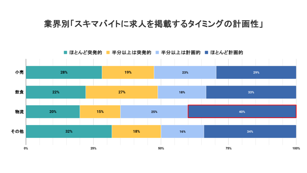 月・日単位で繁閑の波が来やすい小売・飲食業界と、時間単位で繁閑の波がきやすい物流業界で差が見られた。中頻度での利用割合が高い小売業界や、求人を掲載する頻度にばらつきがある飲食業界では、計画性に関する回答割合にばらつきが見られた。一方で、高頻度での利用割合が高い物流業界では、「ほとんど計画的」と回答した方の割合が40%と高くなっており、「ほとんど計画的に、ほぼ毎日出している」という傾向が見られた。