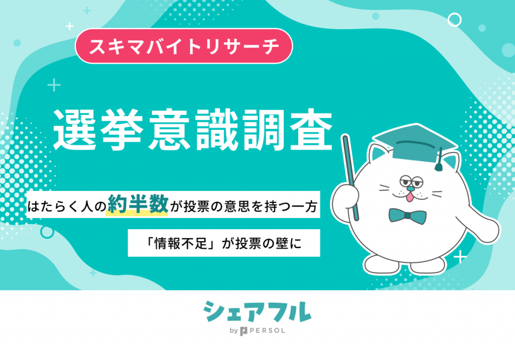 「はたらいて、笑おう。」をビジョンに掲げるパーソルグループのスキマバイトアプリ『シェアフル』やSaaSシフト管理サービス『シェアフルシフト』、就業実績を活用した人材紹介サービス『シェアフルエージェント』などを提供するシェアフル株式会社(本社:東京都港区、代表取締役社長:横井 聡)は、『シェアフル』ユーザーを対象に、選挙意識に関する実態調査を実施しました。