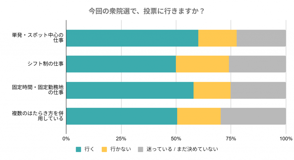 一方、はたらき方別に見ると、いずれのはたらき方においても投票に「行く」と回答した人が一定数いる一方で、シフト制や複数のはたらき方を併用している人のうち半数が「行かない」「迷っている/まだ決めていない」と回答した。