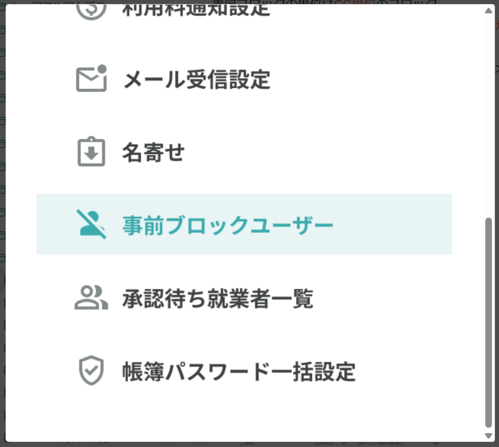 「ユーザー管理」または「就業者(勤怠管理)」ページからユーザー名をクリックすると表示されます。ブロック制限を事前に把握し、限定公開の判断にご活用ください。
