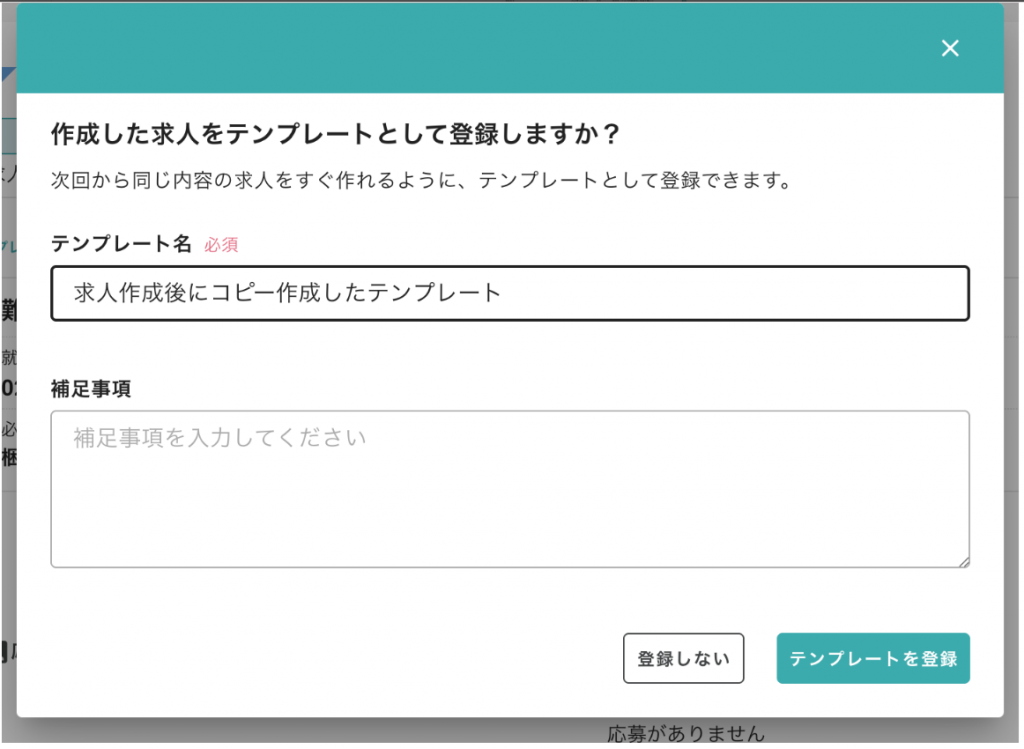 求人作成時、同じ内容のテンプレートが存在しない場合、テンプレートとしても登録できるようになりました。今後のテンプレート運用に向けた準備機能となります。