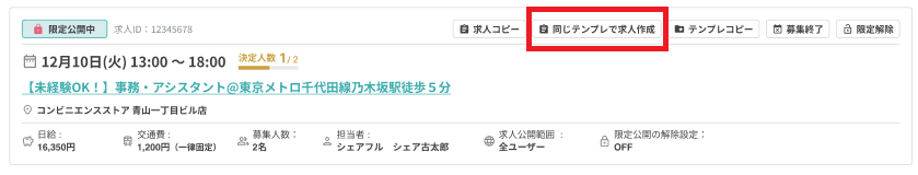 求人作成メニューに「同じテンプレで求人作成」ボタンを追加しました。