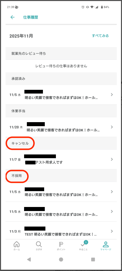 仕事履歴に「キャンセル」「不採用」が表示されるようになりました