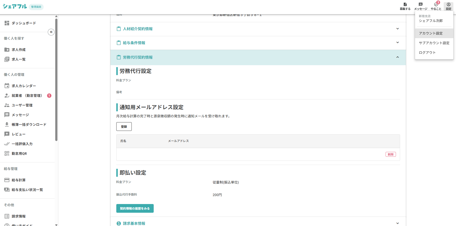 ・管理画面右上「設定」>「アカウント設定」>「労務代行契約情報」