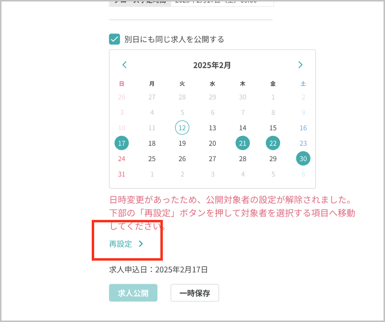 また、対象者が未設定になった場合は、再設定ボタンからスムーズに設定画面へ遷移できます。未設定のままでは求人公開はできません。