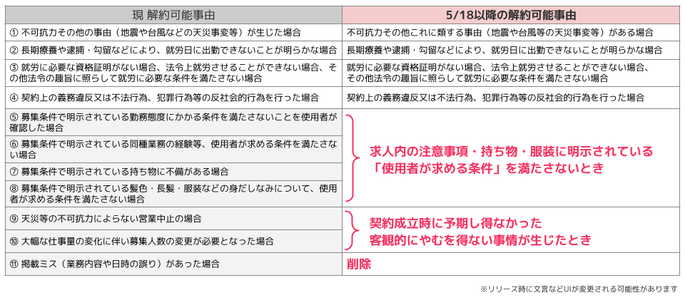 掲載ミスによる解約は不可となり、休業手当ありの解約のみに限定されます。